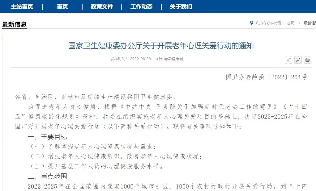 国家卫健委:2022-2025年在全国广泛开展老年心理关爱行动